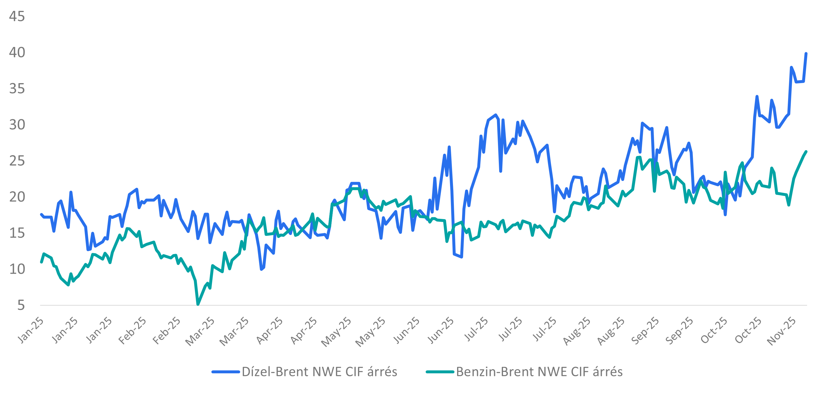 Mégis mi okozta ezt a helyzetet? Itt több tényező összejátszása figyelhető meg. Egyrészt Európa finomítói kapacitásai csökkennek: idén négy nagyobb egység zárt be, mivel nem látják stabilnak a jövő nyersolaj termék (benzin, dízel) keresletét, másrészt az európai szabályozók szigorodása, az egyre drágább CO2 kibocsátási költség és a rákényszerített zöldítés helyett ezek a vállalatok inkább a bezárás mellett döntöttek. Másrészt az EU és az USA egyre szigorúbb fellépése az illegális orosz dízel import, illetve az orosz olajvállalatok ellen szintén emeli a termék árát. Végül érdemes megemlíteni magukat az ukrán dróntámadásokat az orosz finomítók ellen, ami tovább csökkentette az orosz fűtőolaj és dízel exportot. A szeptember-októberi orosz dízelszállítások (587 illetve 650 ezer hordó/nap), 20%-kal voltak kisebbek, mint a 2025 év eddigi átlaga (797 ezer hordó/nap).
