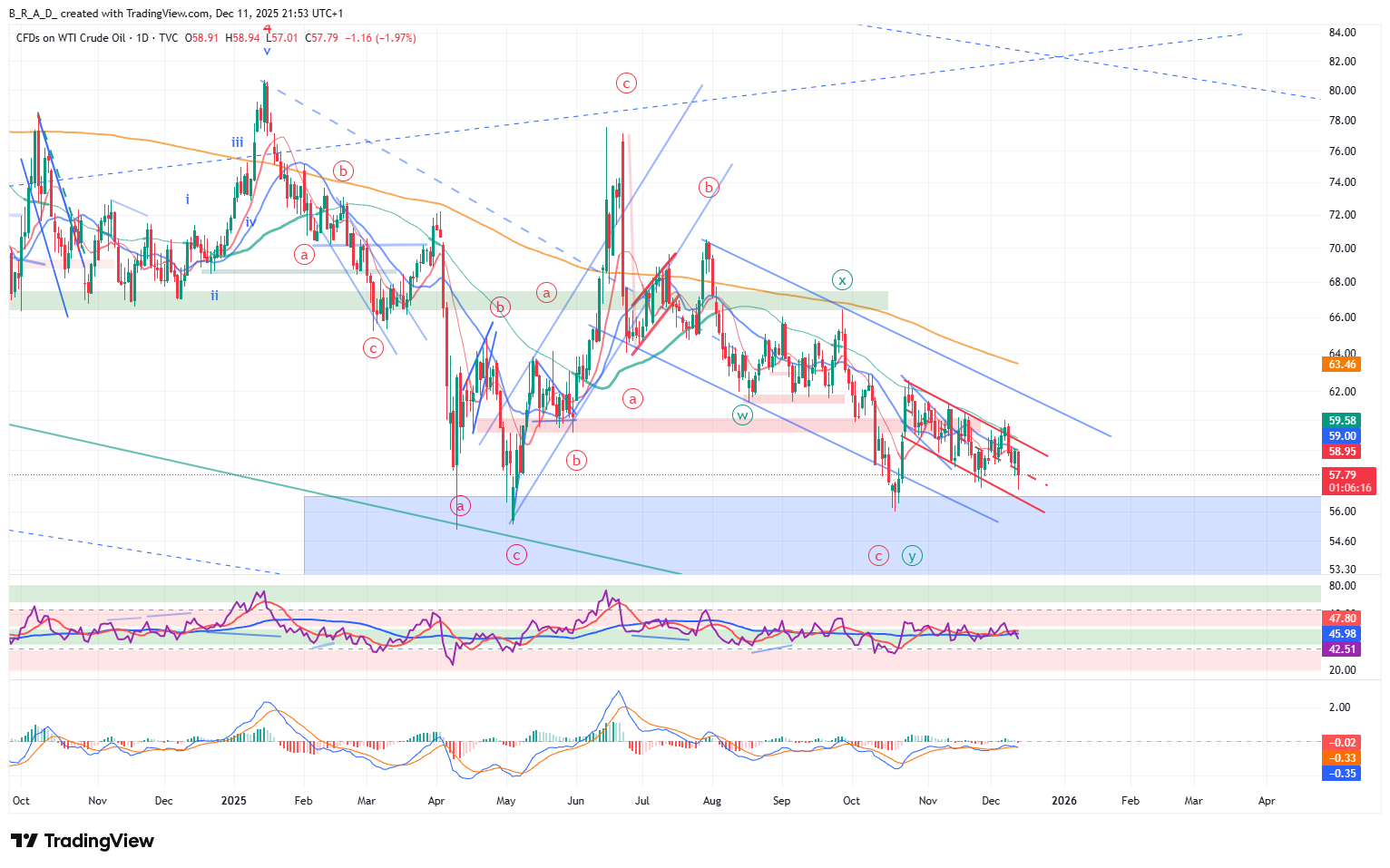 A mozgóátlagok útját állták az emelkedésnek, az árfolyam lefordult az 59,10-es szint környékéről, átvitte a csatorna közepét és egy gyors leszúrással az eső csatorna aljának közelébe jutott. Továbbra is a csatornában mozog az árfolyam, mindkét irányba megpróbálkozott egy – egy kitöréssel, azonban minkét esetben sikertelen lett a próbálkozás. A következő időszakban – alacsony megbízhatósági szint mellett – emelkedésre számítunk, az elsődleges célár 58,50, a másodlagos 59,10.