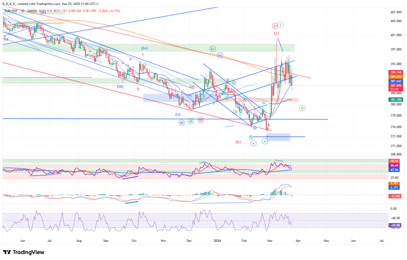 Elliotti megközelítésben vagy egy korrekció C alhulláma halad lefelé (zöld számozás) vagy a pirossal jelölt számozás szerint egy impulzus 5. alhulláma. Ez utóbbi forgatókönyvre egyre kevesebb az esély, amennyiben mégis ezen verzió mentén mozog a piac, a következő hetekben 374 alá bukhat az árfolyam, ennek megerősítéséhez nagyon gyors forinterősödésre lenne szükség a következő időszakban. Amíg nincs a charton kézzel fogható megerősítés a pirossal jelölt verzióra, addig a zölddel jelölt, korrekcióra utaló számozás számít az elsődleges szcenáriónak.